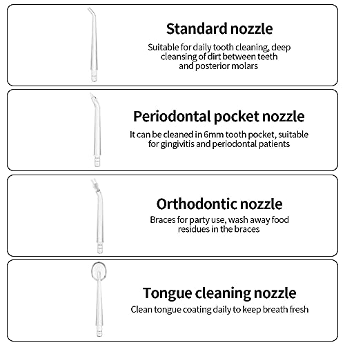 Allround Tandreinigingsgereedschap: 360 roterende mondstuk, nadat het mondstuk is verlengd in de mond, kan de mondhoek worden aangepast om verschillende te reinigen gebieden, om multi-directionele reiniging van de mondholte te te bereiken, 0,6 mm ultrafijne waterstroom, reinigt nauwkeurig de opening tussen de tanden en de dode hoek van de mondholte, gemakkelijk weg te nemen onzuiverheden en voedselresten tussen de tanden en het tandvlees val sulcus